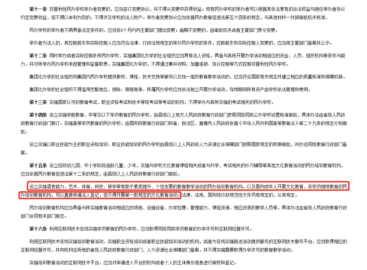 根据中华人民共和国司法部官方网站于8月10日公布的“中华人民共和国民办教育促进法实施条例(修订草案)(送审稿)”里面的第二章第十五条叙述:设立实施语言能力、艺术、体育、科技、研学等有助于素质提升、个性发展的教育教学活动的民办培训教育机构,以及面向成年人开展文化教育、非学历继续教育的民办培训教育机构,可以直接申请法人登记,但不得开展第一款规定的文化教育活动。