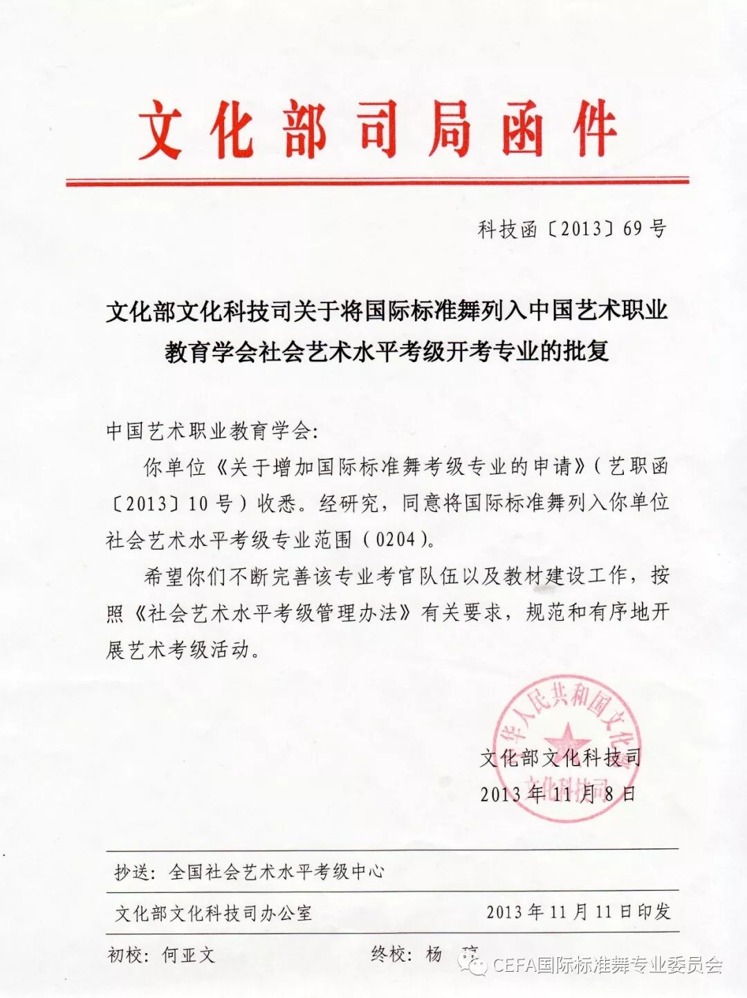 经国家文化部批准同意,全国一级学会组织--中国艺术职业教育学会CEFA从2013年11月8日正式开始国际标准舞社会艺术水平考级工作,文化部司局函件-科技函[2013]69号,专业目录编号:国际标准舞(0204)。
