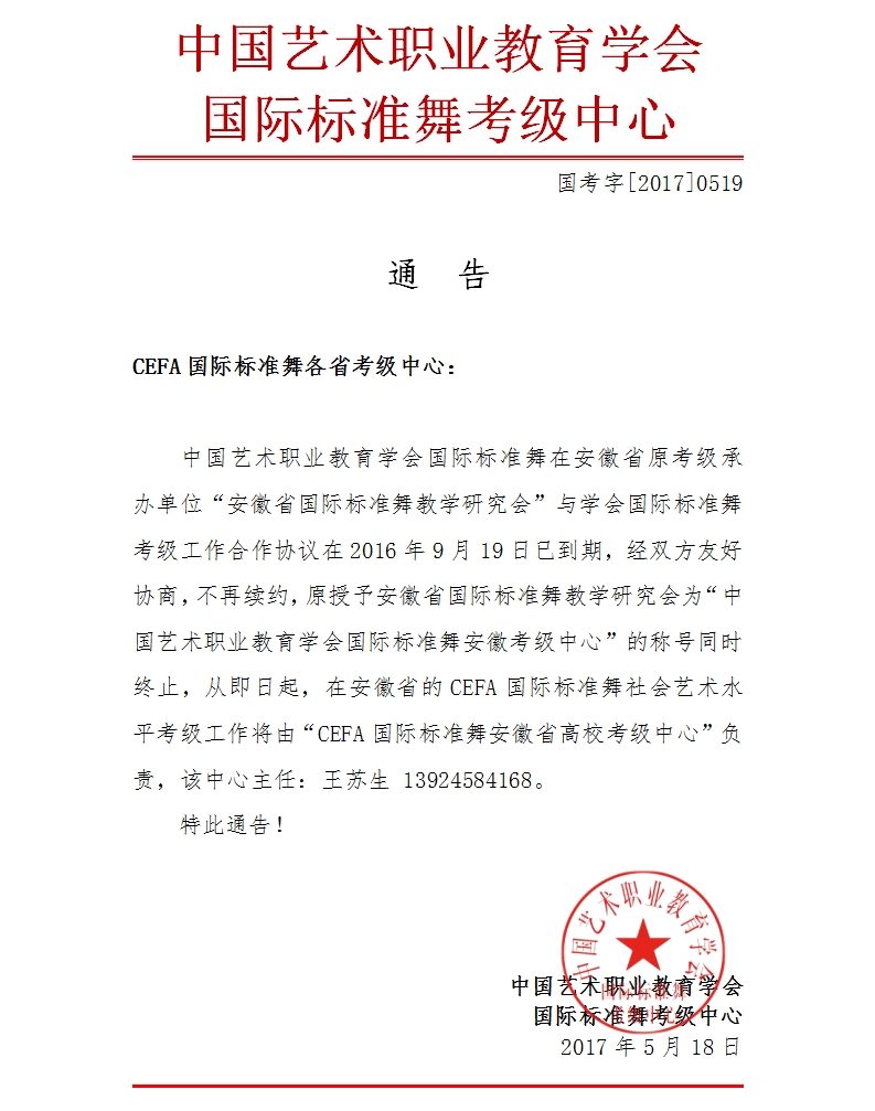 考级中心通告-原安徽省国际标准舞教学研究会工作授权终止